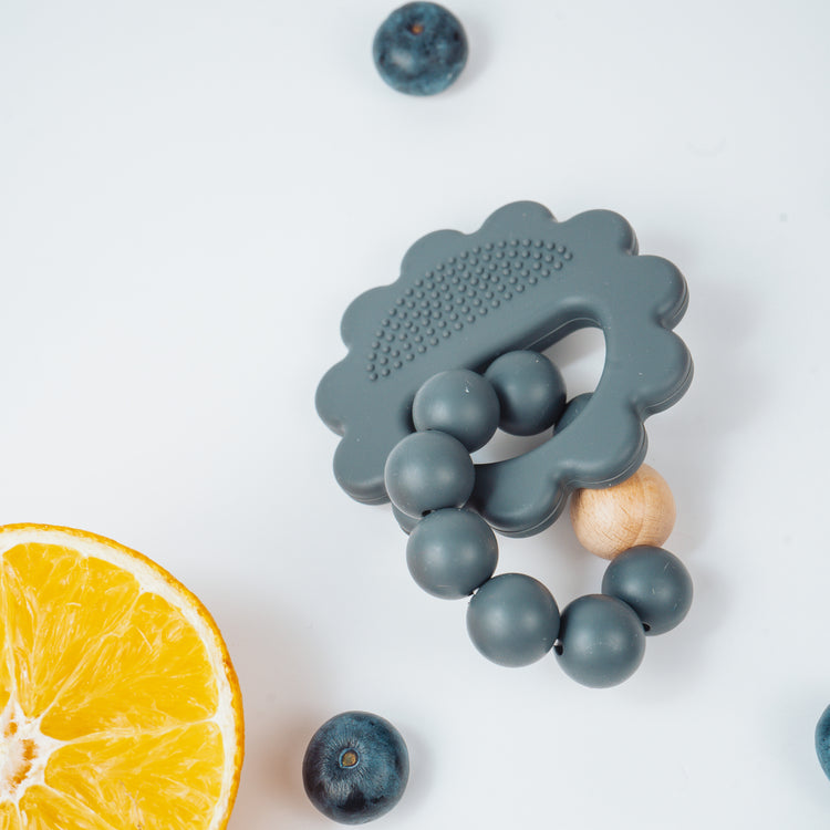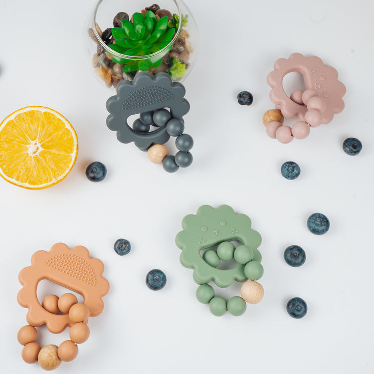 Give your baby soothing relief and a fun toy with this silicone and wood sensory teether , perfect for stimulating their senses while soothing their gums.
